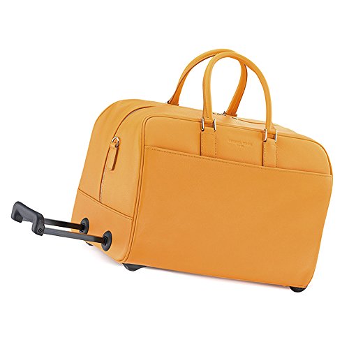 This versatile luxury bag with trolley function is made in fine deer grained cowhide leather. It has two top leather carrying handles and a pull out handle and wheels for easy manouverability. The bag has an exterior zipped compartment on either side and the interior is fully lined with an inner pocket. The bag comes complete with a detachable shoulder strap and a luggage tag.