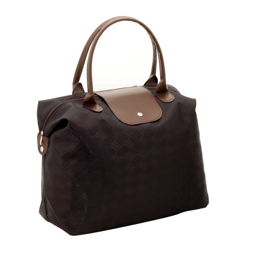Description : A brand new ladies weekend bag with a checked, weave design. There is one main compartment with a zipped closure and a flap which closes with a press stud. Measuring 38 x 32 x 17cm in total this bag will make a chic travel overnight bag. Available in brown or black, both colours have the same design. Supplied folded up, it can be folded when not in use for easy storage.