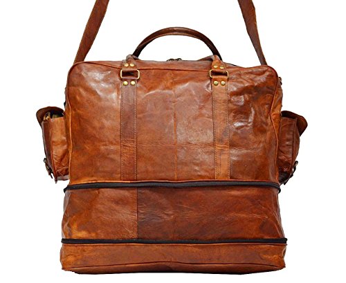 - Material- Full grain Goat hide (sustained) Bag Size- 18"(H)*10"(W)9"(B) inches. Inside strong lining 3 outer pocket and top zipper closure 54" long adjustable shoulder broad strap and handles to carry. This bag has ouside zipper around to make this bag smaller also. you can adjust its height according to your need. . Treated with Natural ingredients.