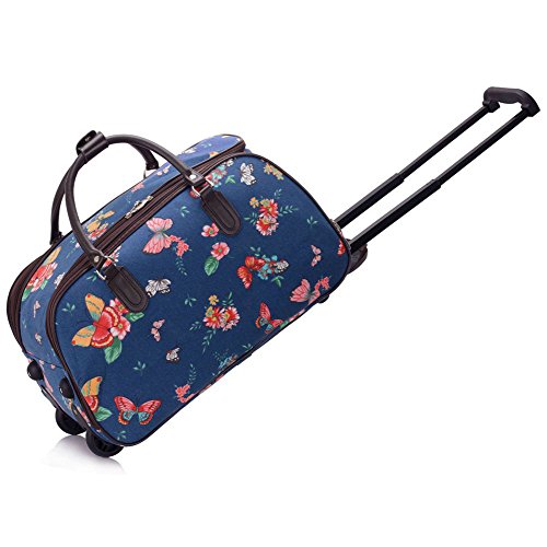 Description : New L and S designs canvas style pull along butterfly print cabin bag, weekend bag, travel bag, luggage. Double grab bag handles, double zip top, pull out handle for pull along with wheels design, studs for free standing. Cabin size.