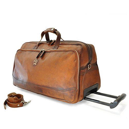 Description : Luxury holdall, travel bag designed and made in Italy by craftsmen in Italian leather at Pratesi A classic holdall made in aged vegetable tanned leather a unique tanning technique to Pratesi. A rectangular shape bag with long top zip closure, outer zip compartment and Pratesi logo badge on front double top handles. The hardware is brass and the single roomy interior compartment is plain lined and has a zip wall pocket. Plus to add to its versatility it becomes a trolley bag as there are 2 wheels...