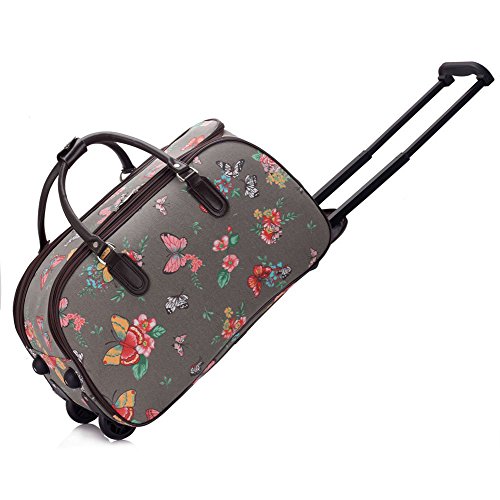 Description : New L and S designs canvas style pull along butterfly print cabin bag, weekend bag, travel bag, luggage. Double grab bag handles, double zip top, pull out handle for pull along with wheels design, studs for free standing. Cabin size.
