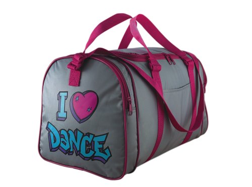 - Available in grey with contrast cerise pink piping and a funky graffiti style "I Love Dance" logo print at both ends of the bag. Bag has both carry handles and an adjustable cerise pink shoulder strap.